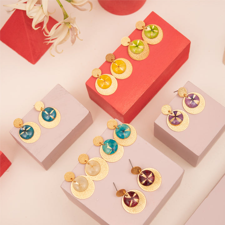 *Arete geometrico mini circulos, resina, herraje baño oro 24 K.
