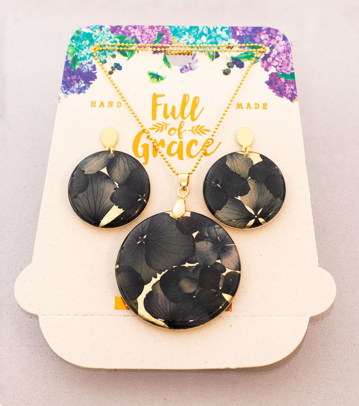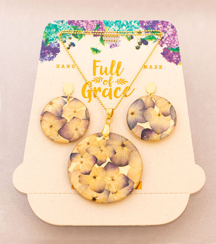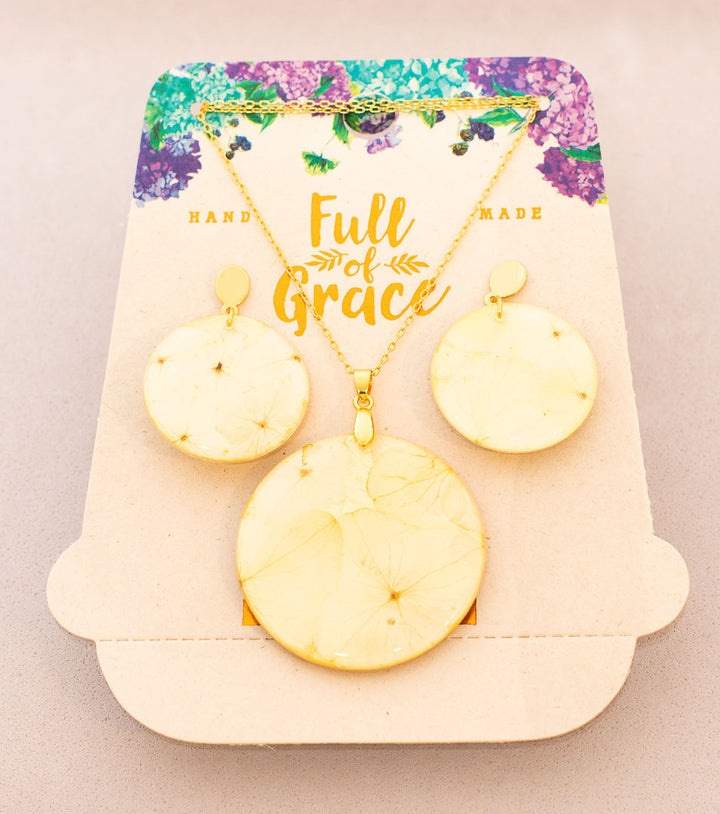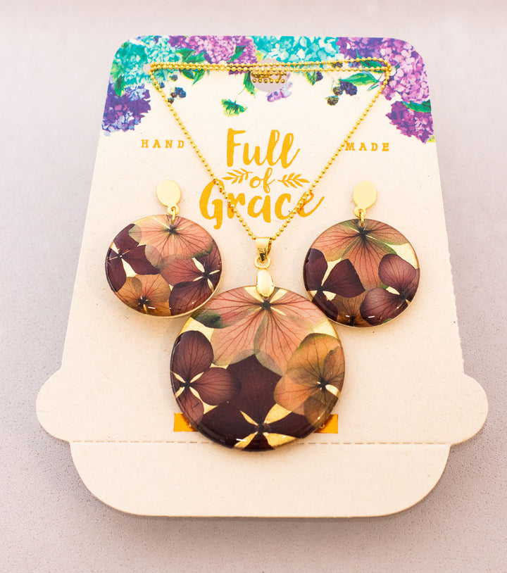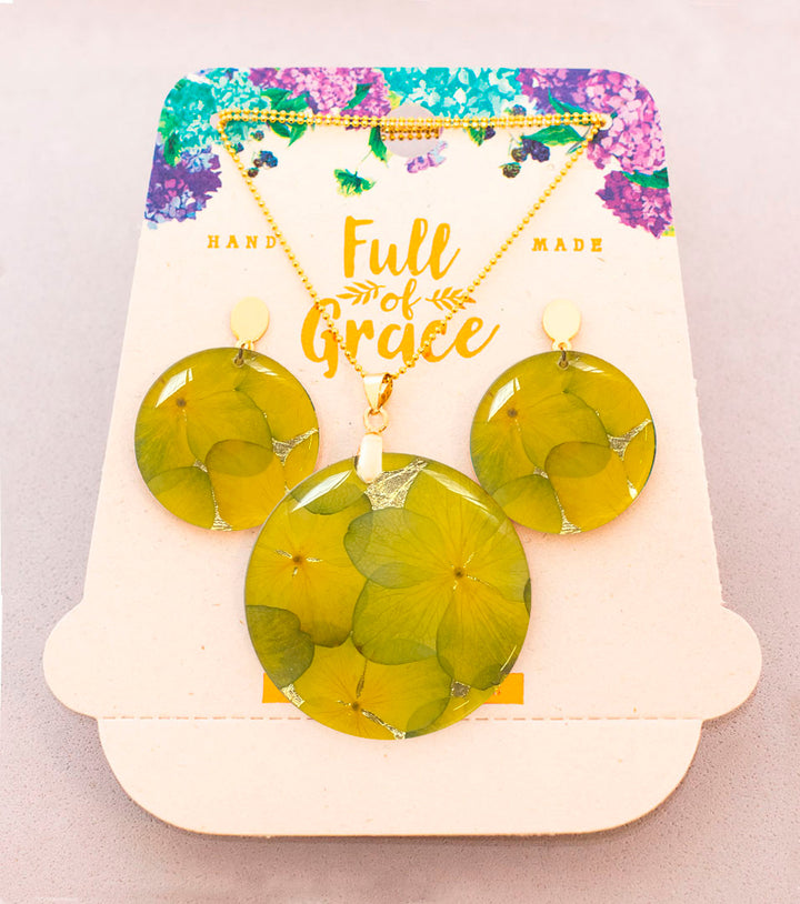 *Juego aretes y collar circulares resina, herraje baño oro 24k.
