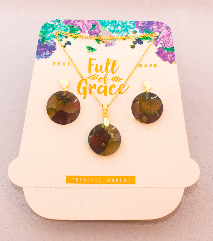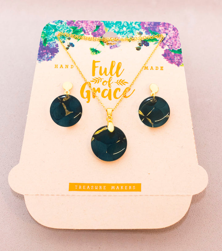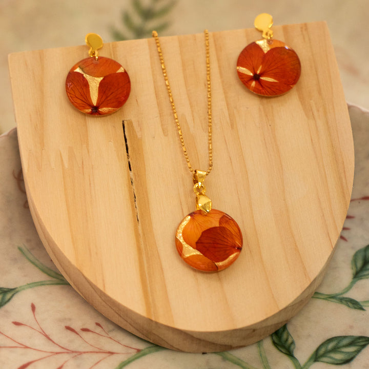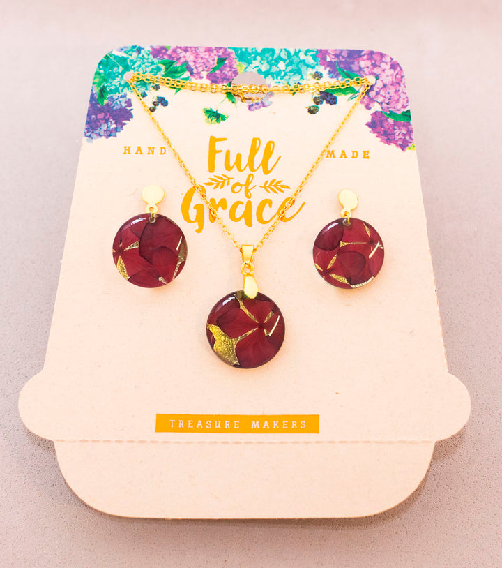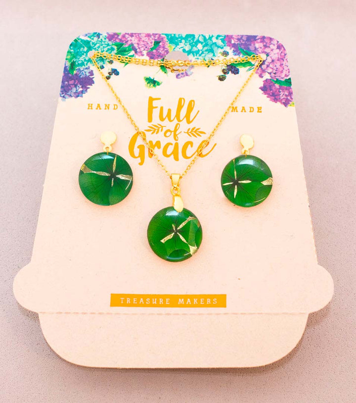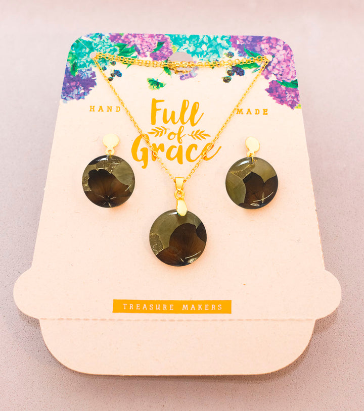 *Juego aretes y collar circular resinado con cadena baño oro 24k.