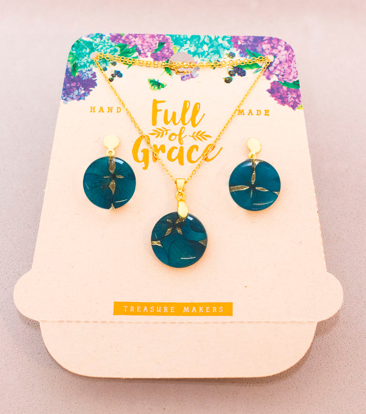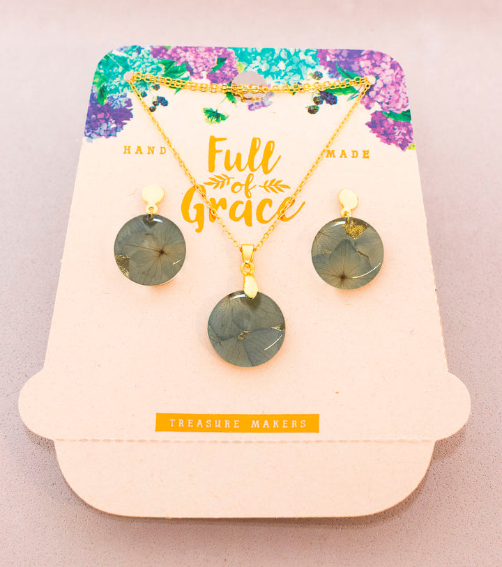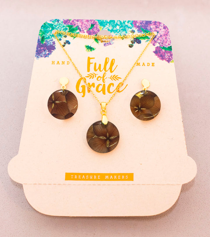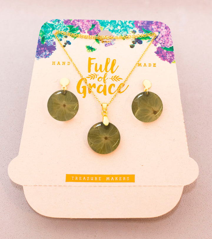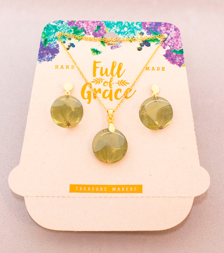 *Juego aretes y collar circular resinado con cadena baño oro 24k.